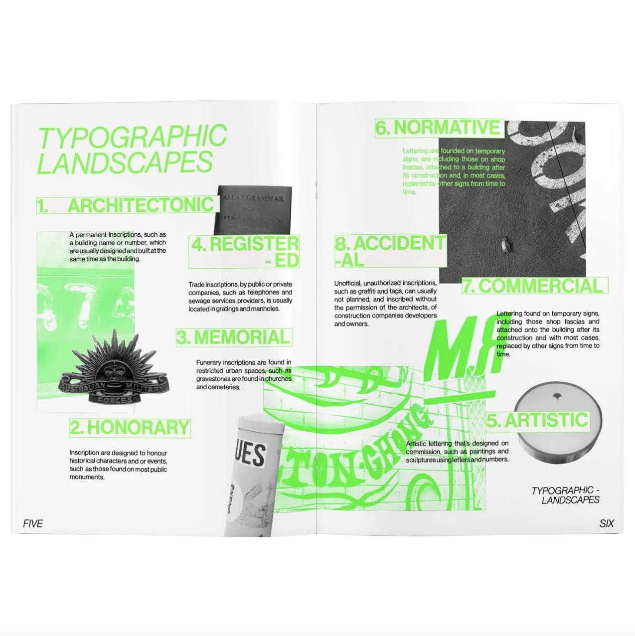 Since designing for a visually sophisticated audience, I paid close attention to the typographic detailing and experimental layouts. For the Letters and Cities article, by Robert Bringhurst, I used gradient maps and collaged elements typography found within my local area by wayfinding to correspond with the article.
